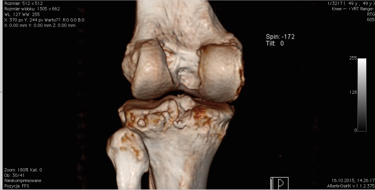 Obraz stawu kolanowego (od tyłu) wykonany tomografem komputerowym w technologii 3D.