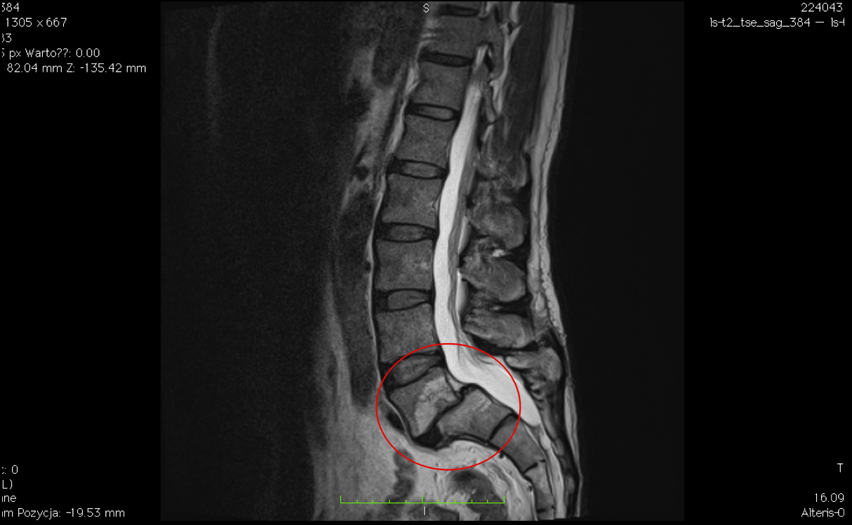 Bardzo zaawansowany strukturalnie kręgozmyk L5-S1 (II/III stopień), dający pacjentowi niewielkie dolegliwości bólowe oraz znikome objawy neurologiczne.