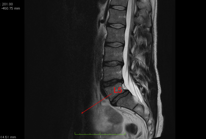 Przodozmyk kręgu L5 spowodowany między innymi zaburzeniami kończyn dolnych oraz innych odcinków kręgosłupa.