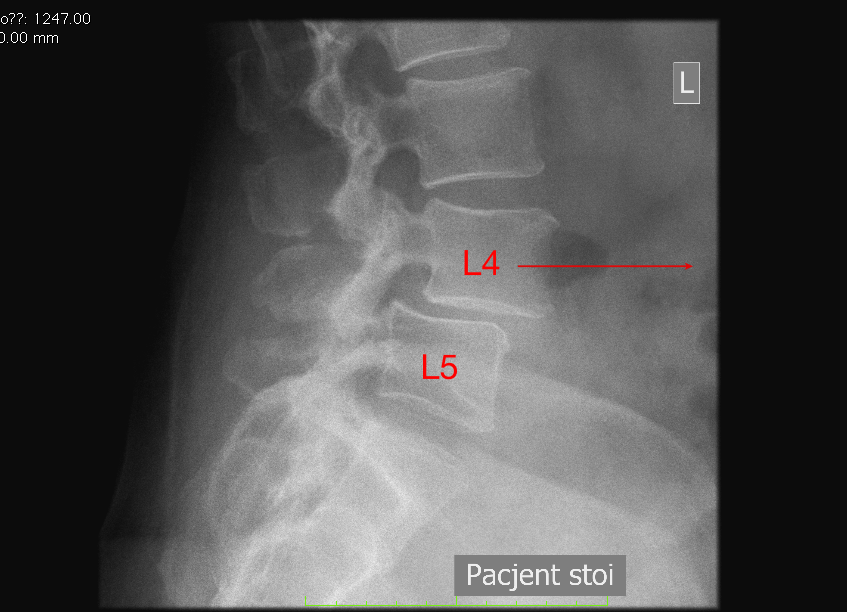 Kręgozmyk segmentu L4-L5, czyli translatoryczne przemieszczenie się kręgu L4 względem poniżej leżącego L5.