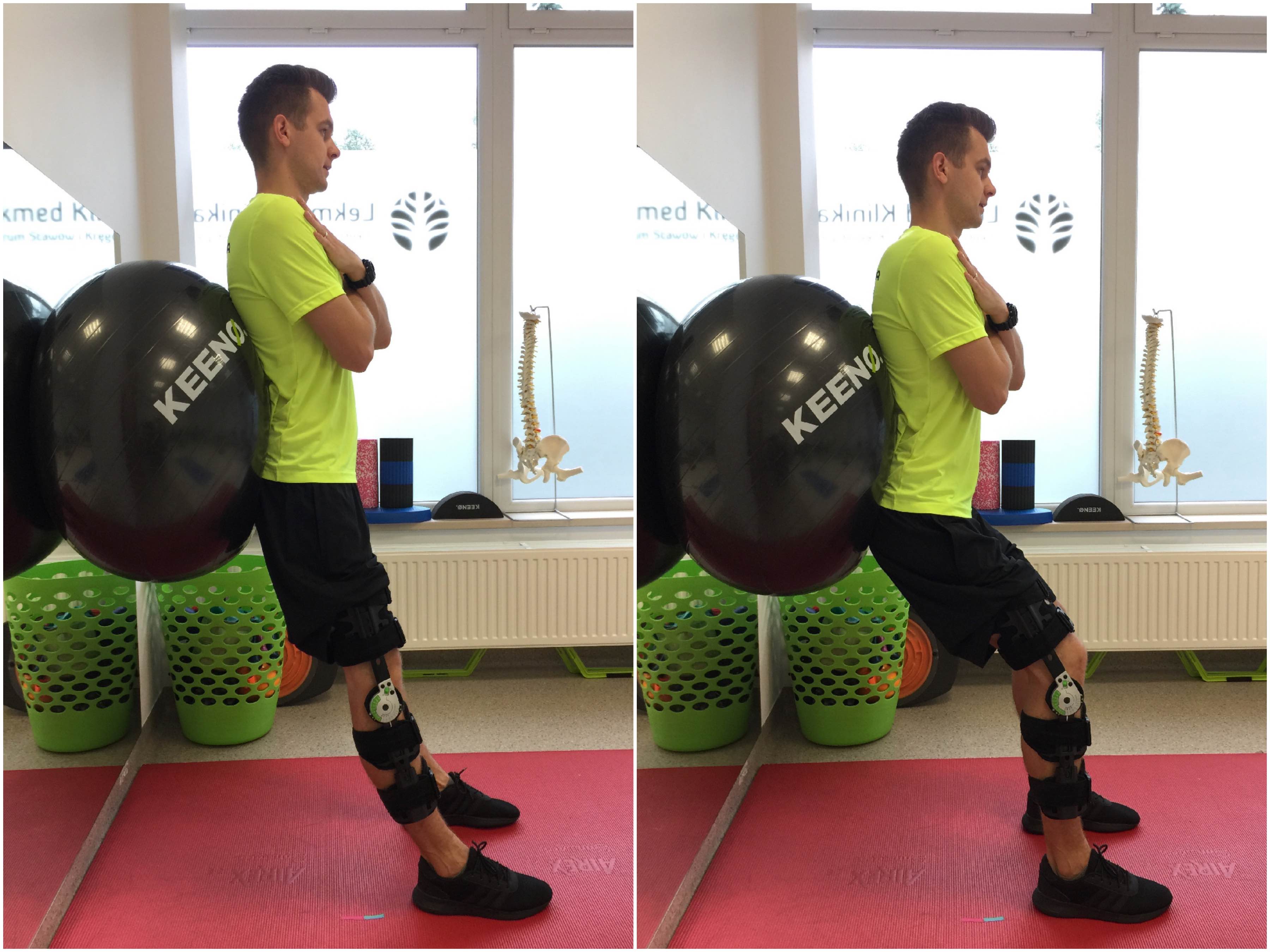 Mini przysiady w zakresie 0-30° zgięcia kolana w pierwszym tygodniu po zabiegu warto wykonywać w ortezie.
